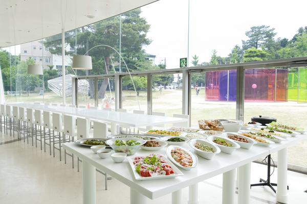 位於美術館內的餐廳Fusion21,以「創造美術館的第二份感動」為理念,將藝術與飲食體驗結合。餐廳空間採用大片落地玻璃設計,室內光線明亮開放,用餐時可以望見美術館庭園與戶外藝術作品,彷彿成為展館的一部分。餐廳料理以加賀蔬菜等當地食材為特色,提供現代法式風格的午餐、咖啡與甜點。