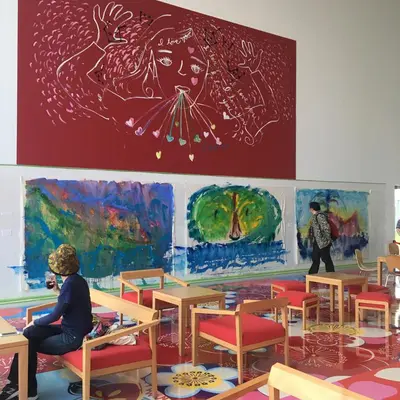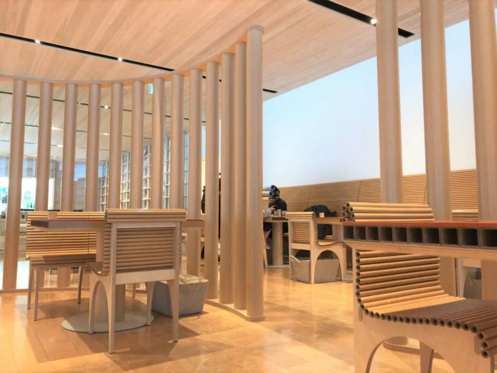 館內的 cube cafe & shop 就位於其中一座建築中,延續了美術館的現代感設計,簡潔明亮,充滿藝術氣息。咖啡館外牆由英國藝術家Paul Morrison繪製的蘋果樹圖案相當醒目,成為空間標誌;室內地面則鋪有台灣藝術家林明弘創作的花卉圖案,靈感來自十和田傳統織物「南部裂織」,如同一件巨大的藝術作品。
