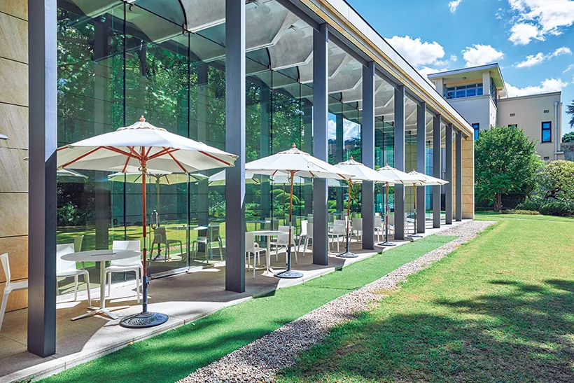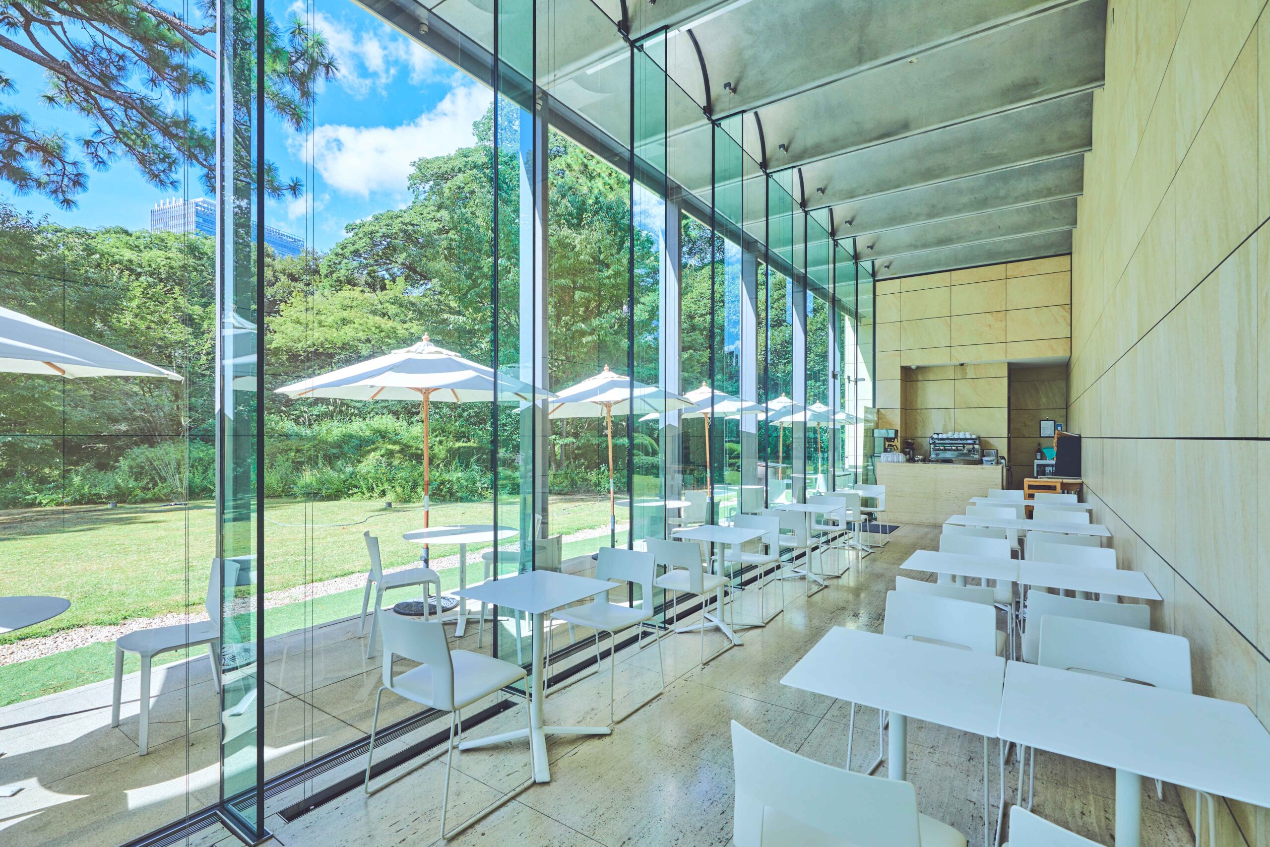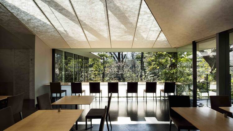 而隱身於這片綠意中的NEZUCAFE則是觀展後放慢腳步的理想休憩場所。這間咖啡館座落於庭園一角,三面以玻璃環繞,透過大窗可欣賞外頭隨季節變換的庭園景色,營造出自然與室內空間連結的雅致氛圍。