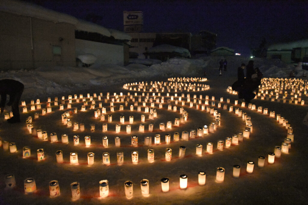 蠟燭被擺成環狀,一圈圈地在雪地上擴散,像靜靜旋轉的光之漩渦。