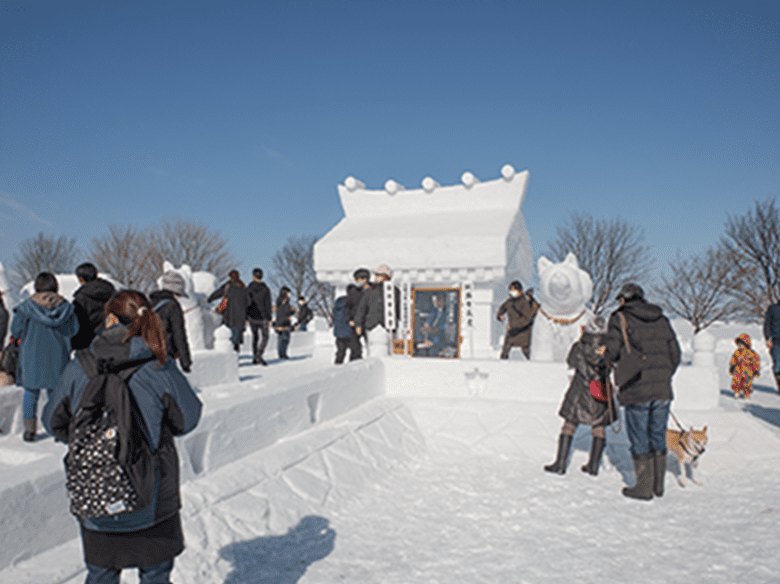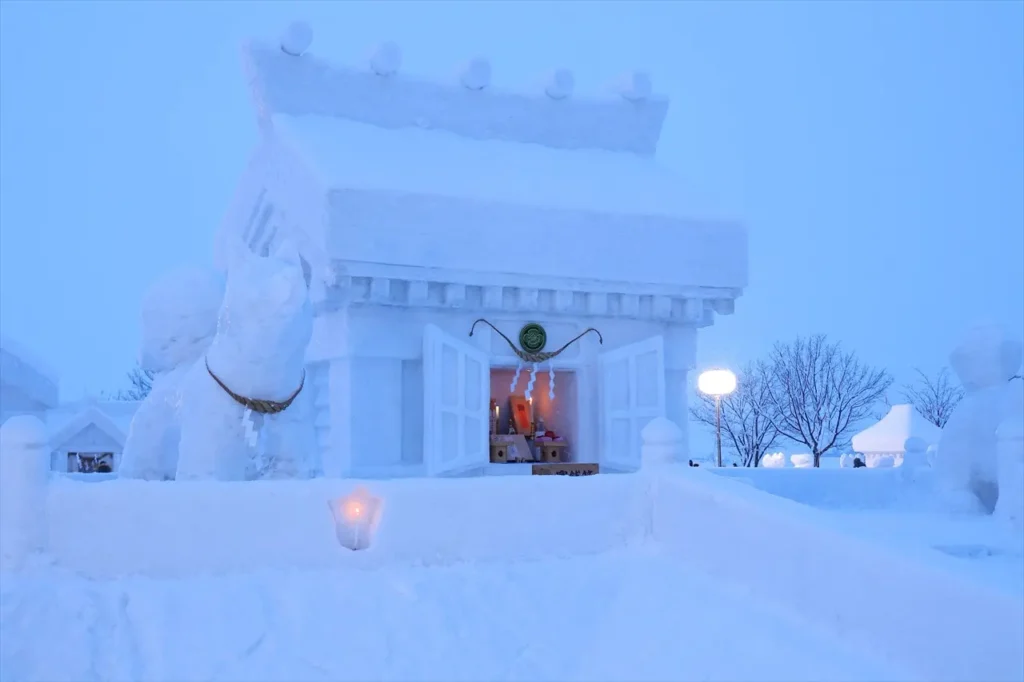 走進會場時,旅人會發現整片雪地像被無數個小小的神社點綴。廣場上在雪白的大地上,立著一個又一個十分厚實的犬子神社雪雕,極有儀式感:雪被壓得乾淨平整、洞口用細工具修得銳整,裡頭放著一對或三隻白米粉捏成的「犬子」。