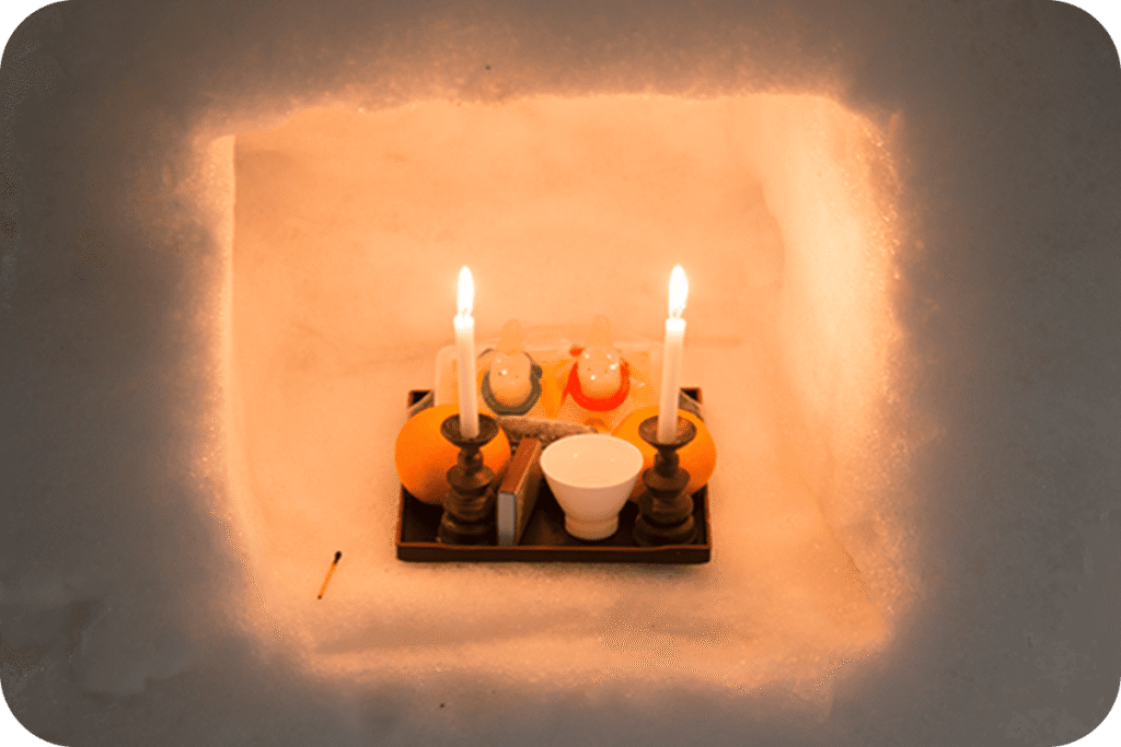 犬子祭最初的形態,正是這一座座由雪堆砌的小禦堂。孩子們在舊曆元宵節的夜裡,把燭火、糯米糕、甘酒和米粉捏成的小犬一同供進雪洞裏,祈求新年的平安。 這個習俗流傳至今,成為今日犬子祭最重要的景象。