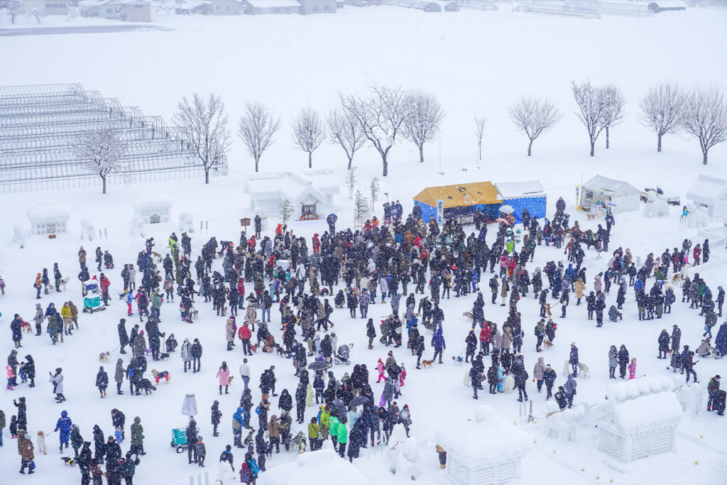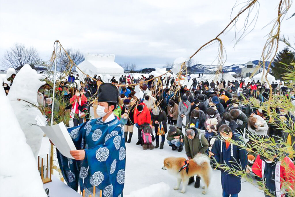 ——愛犬祈願祭。 由雪堆砌而成的「犬子神社」矗立在會場中央,簡潔而純白,像是冬季才會出現的臨時聖域。神職者會在此為狗狗進行祈願,而參加祈禱的犬隻從小型柴犬、秋田犬到外國品種都有,牽繩在雪地上留下一排排輕盈腳印。