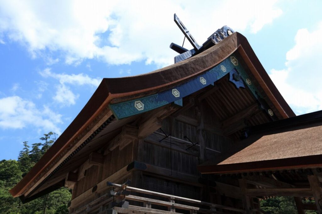 視野盡頭,木色的本殿緩緩顯現出輪廓。出雲大社以木質外觀為主,不施繁複裝飾,保留木材最自然的顏色與紋理。天然檜木未經過分雕琢,在歲月與風雨的浸潤下,泛著溫潤而深沉的色澤。這便是“大社造”——日本最古老的神社建築形式。切妻造的屋頂線條分明,正面設置的階梯穩穩向上延伸,屋脊上高挑的「千木」與「勝男木」如莊嚴的冠冕,靜靜指向天空。殿身巍然高聳,雖已不及傳說中古代那近乎通天的四十八公尺,但二十四公尺的現存高度,仍足以讓人仰望時,感受到一股無聲的、來自古代信仰與權勢的磅礴力量。