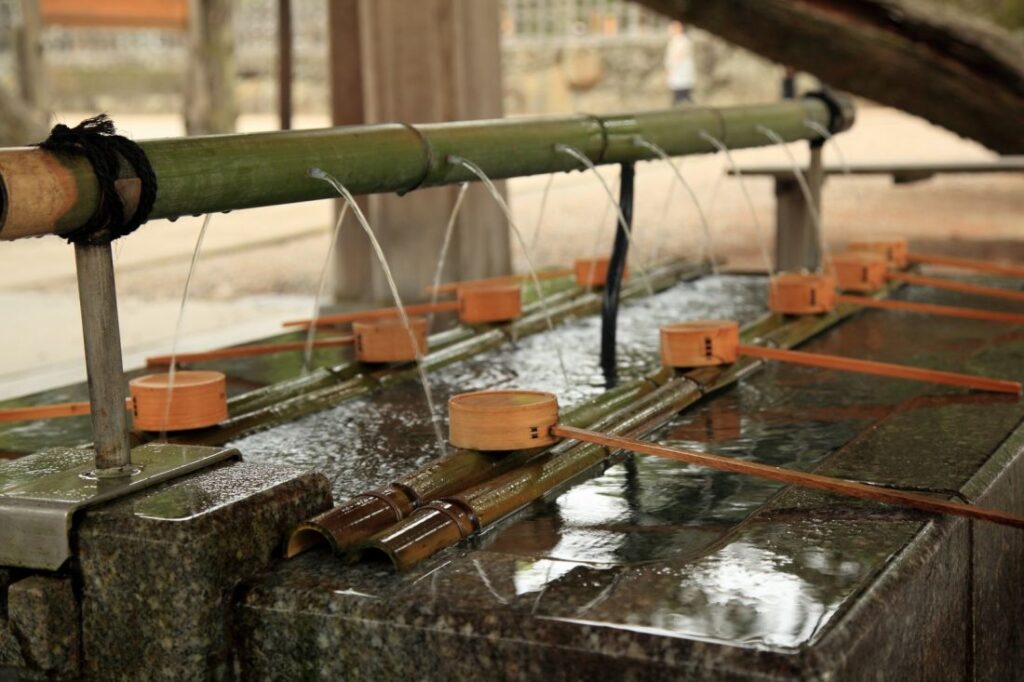 沿著參道前行,砂石輕響,杉木挺立,寒風拂過枝梢。沿途,往來的參拜者默契地避開道路正中的通道,從側道緩步進入出雲大社——中間的正中之道象徵神明的行走軌跡,留白本身就是敬意。參拜前,人們先前往手水舍淨手漱口,感受冷冽的水流滑過指尖,如同在門外輕輕拂去尘念,讓身心都回到最純粹的狀態。
