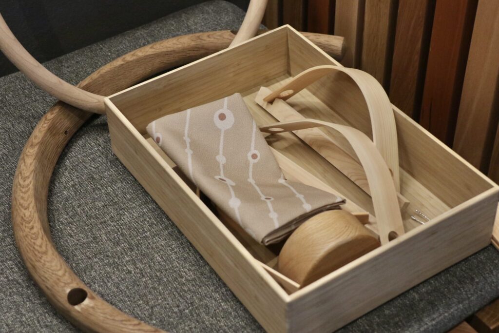 當木材成形為漂亮的半月形手柄後,將「界」原創的風呂敷穿過並綁結,便完成了一款獨具風格的手提包。