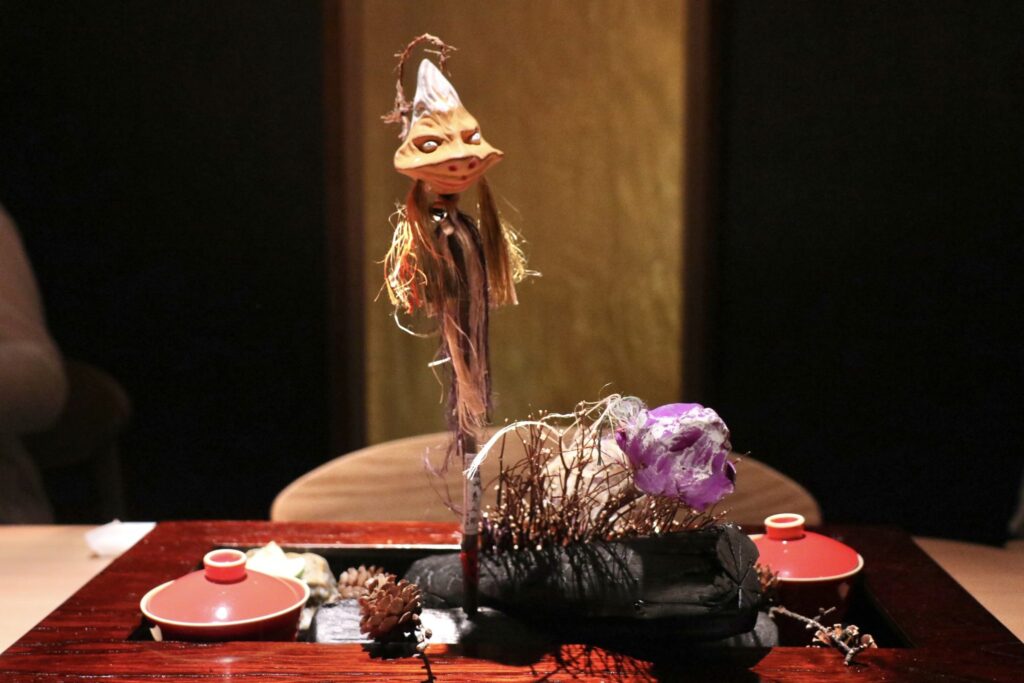 入座後,首先映入眼簾的是一尊極具存在感的人偶。這尊人偶被稱為「山彥人形」,象徵山靈的分靈,長久以來被視為帶來好運、驅邪避凶的護身象徵。其頭部造型寓意飛驒山脈連綿的群山,而面容則表現出人們對自然懷抱的敬畏之心。