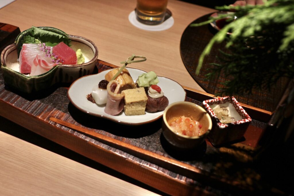 左側為三種刺身拼盤,右側則是清爽的醋物;中央的八寸,則以「雞肉與葡萄乾松風」與「秋刀魚丸佐毛豆泥」等料理構成,表現出隨四季更迭而變化的色彩與風味。