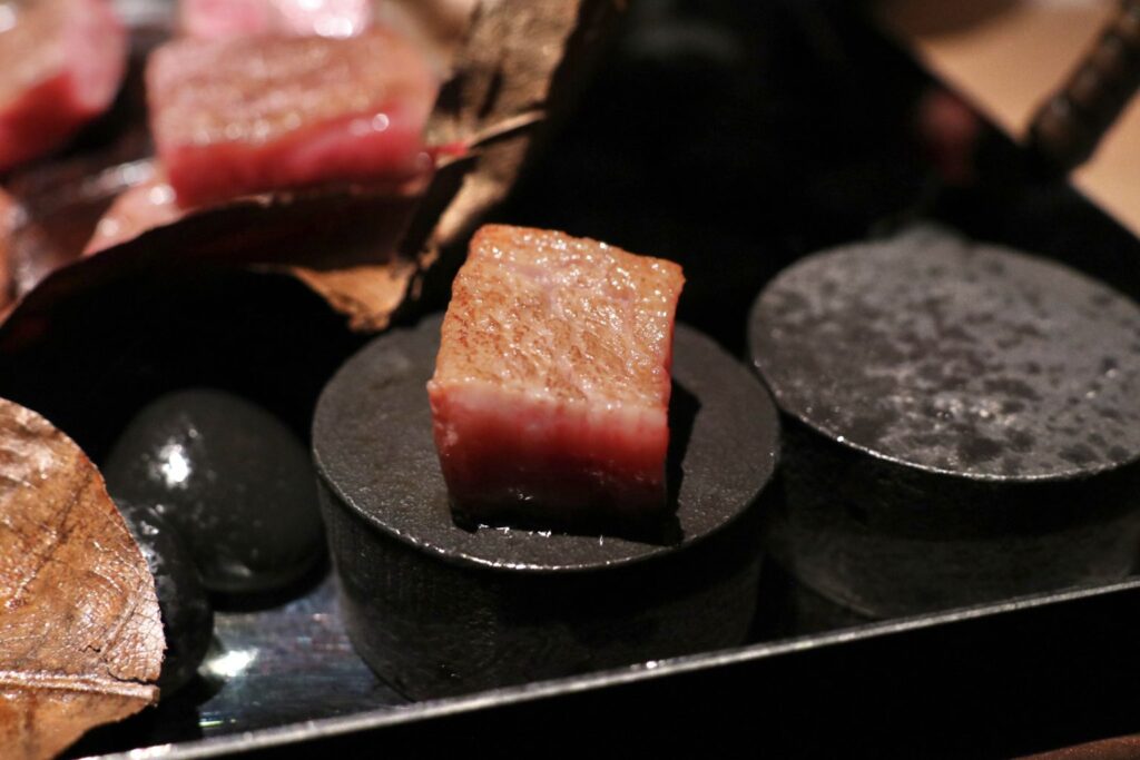 入口即化、柔嫩至極的牛肉,讓人不禁感嘆唯有「幸福」二字足以形容。搭配鹽與山葵等簡單調味,更能細細品味食材本身的純粹與美好。