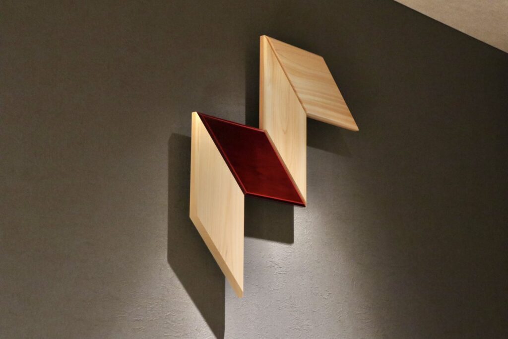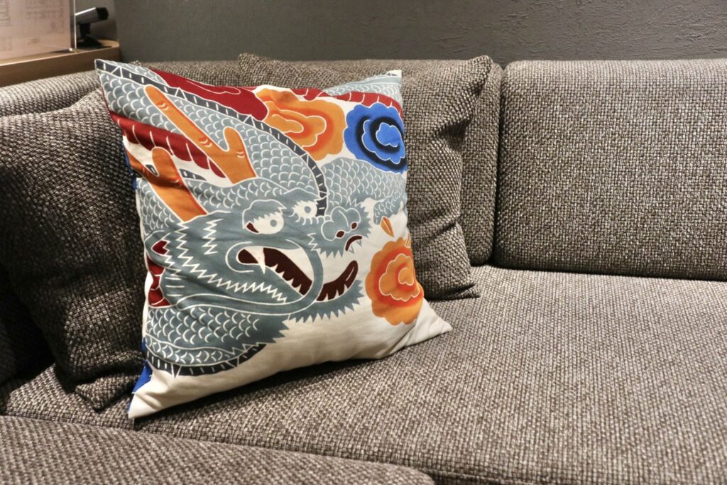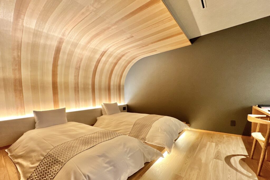 室內並點綴著以飛驒傳統漆藝「飛驒春慶」製作的壁面藝術,以及飛驒染的原創抱枕,為空間增添細膩的色彩。