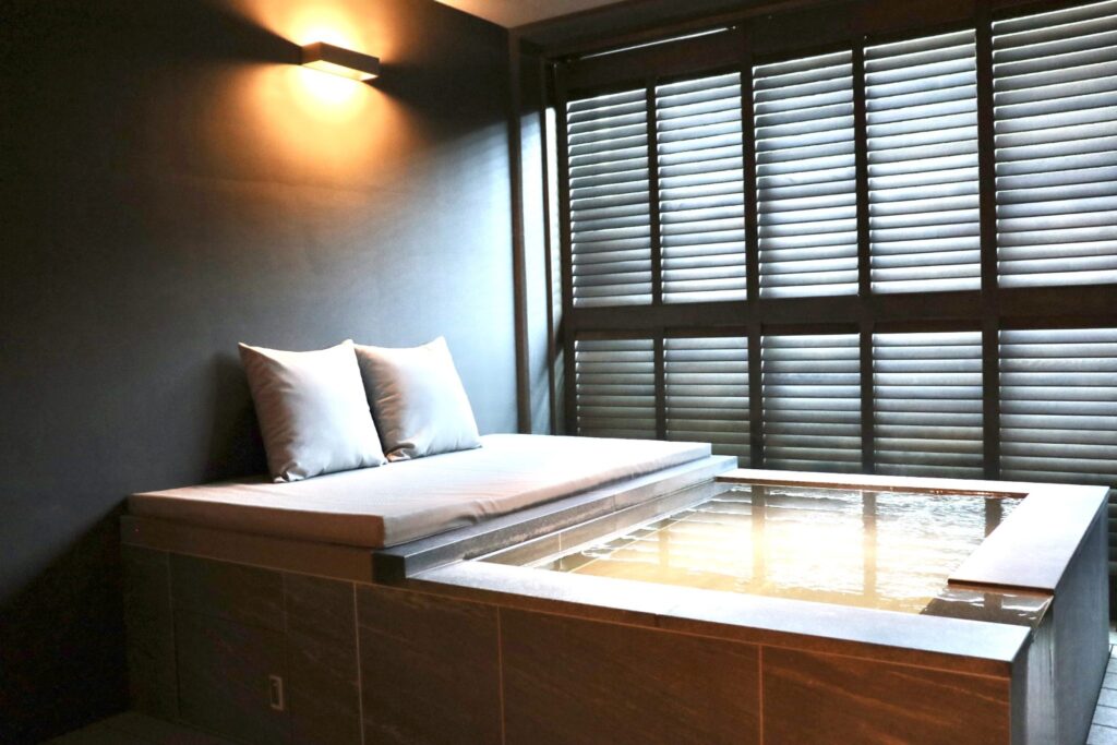 露天風呂旁設有可直接濕身坐上的沙發,讓人無需顧慮時間,自在地沉浸於奢雅的泡湯時光。