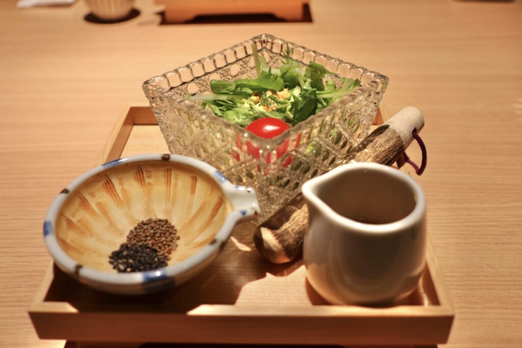 首先端上桌的是「沙拉膳」,可親自研磨芝麻,感受緩緩釋放的香氣。