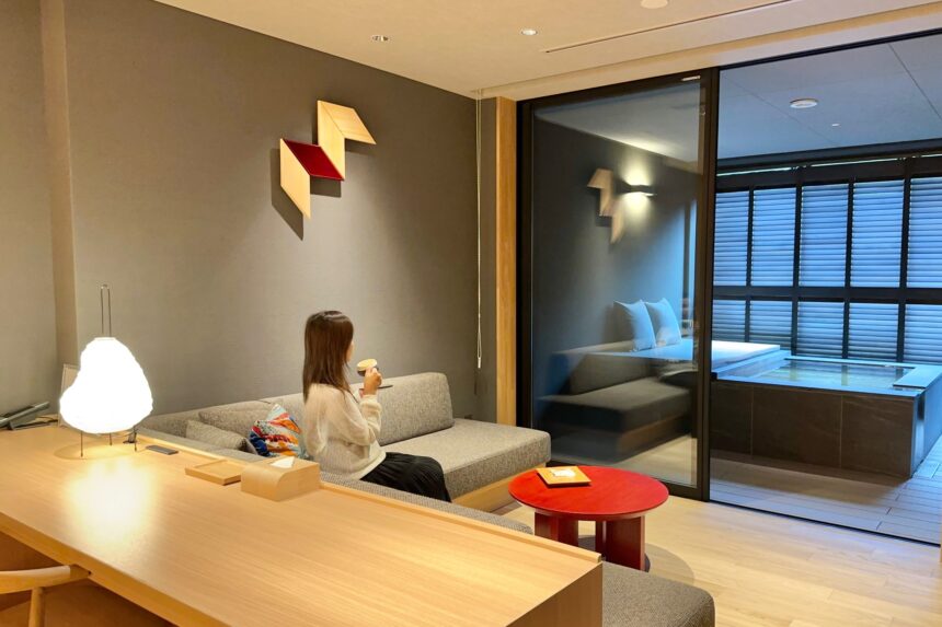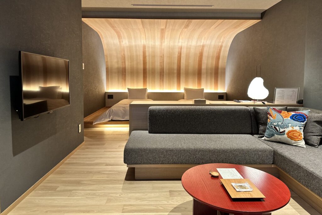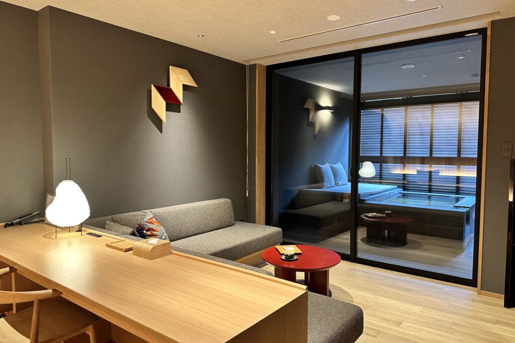 此次入住的「附露天風呂客房」,設有寬敞的長桌與舒適的沙發空間,也非常適合進行 workation(結合工作與度假的生活方式),整體格局寬廣,展現出奢雅從容的居住體驗。