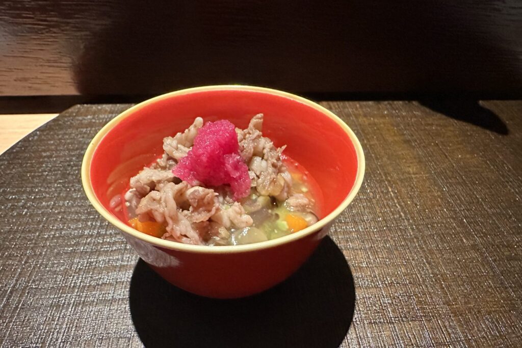 在「界 奧飛驒」,所呈現的先付為「Suttate與牛時雨煮」。所謂「Suttate」,是飛驒地區的傳統鄉土料理,類似冷湯,將蔬菜等食材於研缽中細細研磨製成;其上再鋪上以醬汁慢煮入味的牛肉時雨煮。