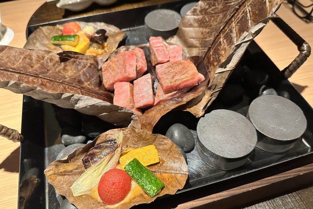 這道料理以肉質細緻、風味豐潤著稱的飛驒牛為主角,搭配朴葉一同享用。經過表面輕微炙燒的牛肉,再由客人自行於燒石上調整至喜愛的熟度。