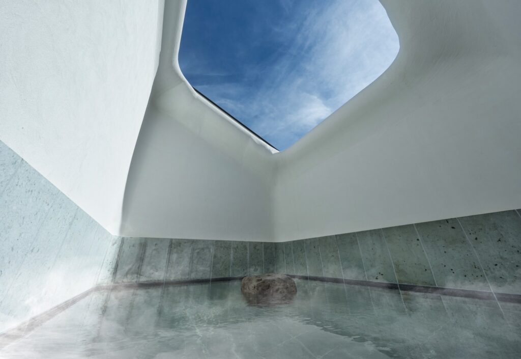 被象徵雪景的圓潤流線牆面所包覆,在潺潺水聲中仰望那一方被切割出的天空,享受極致靜謐的療癒時光;夜晚則可一邊泡湯,一邊仰望滿天星辰。