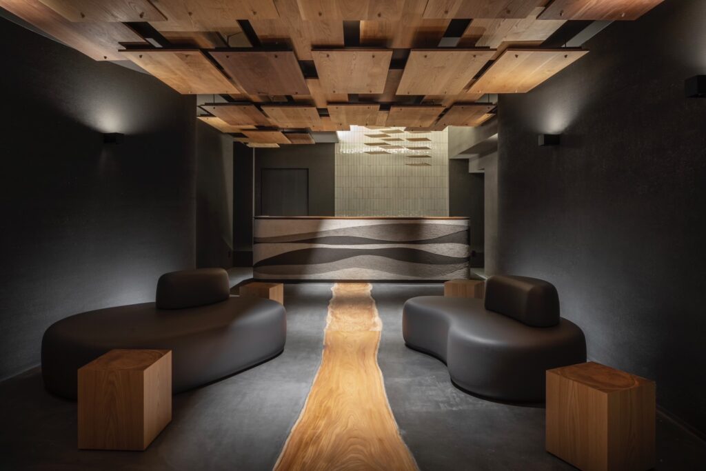 從入口延伸至櫃檯的木質地板,以柔和流動的線條表現出河川的意象;一旁擺放的灰色沙發則象徵岩石,而閃耀著細緻光澤的牆面,則令人聯想到奧飛驒的雪景之美。