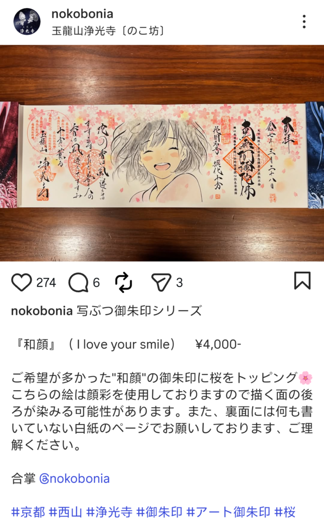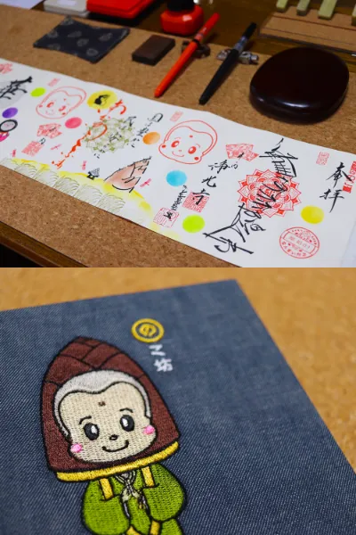 現在,這位小和尚被住持親手畫進了各式各樣的御朱印裏。每一枚都是“一期一會”的相遇——只在那一刻、那一地,為你而出現。所以,每個人拿到手的那一枚,都是一個獨一無二的紀念品。除了「のこ坊」的形象之外,住持也會在朱印上即興手繪動漫風角色,畫面十分精美。