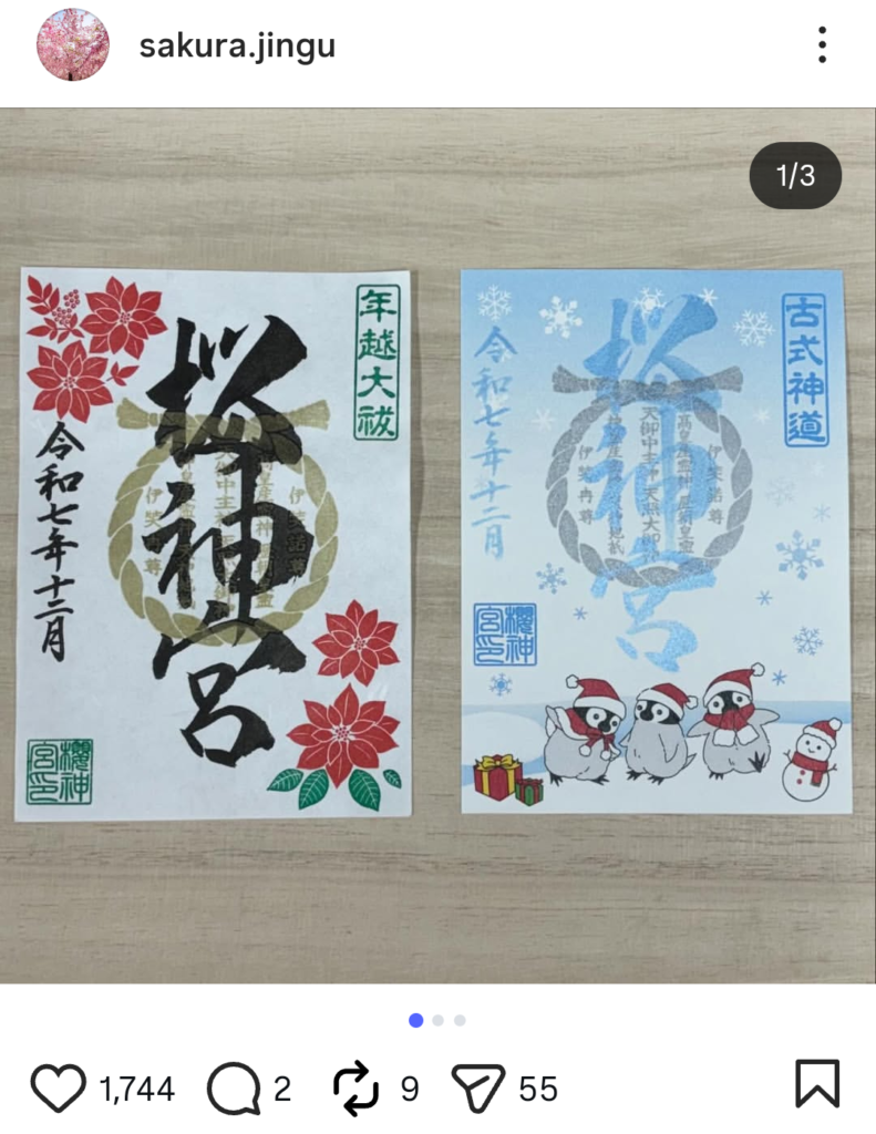 櫻神宮位於東京,是一座以古式神道為傳統的神社,也因為四季景色和櫻花而受到遊客喜愛。櫻神宮的御朱印設計多樣,會隨著季節和月份變化,圖案經常加入當季的自然元素,如櫻花、草木或節氣主題。