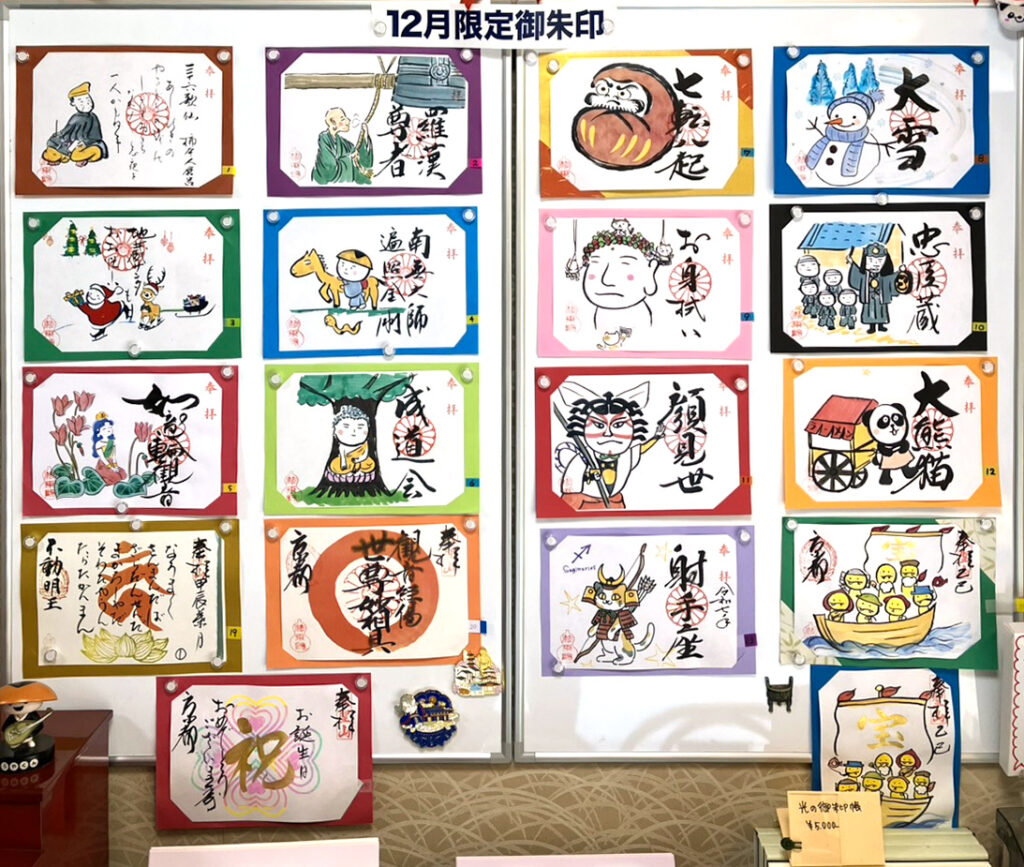 法乘院的御朱印以月替限定為特色,每個月都會根據當時的季節與主題進行調整。朱印圖案多圍繞佛像意象、二十四節氣、星座展開,比如12月份,有射手座、雪人、聖誕老人的限定圖案。即使是同一座寺院,不同時間來參拜,拿到的朱印也會有所不同。