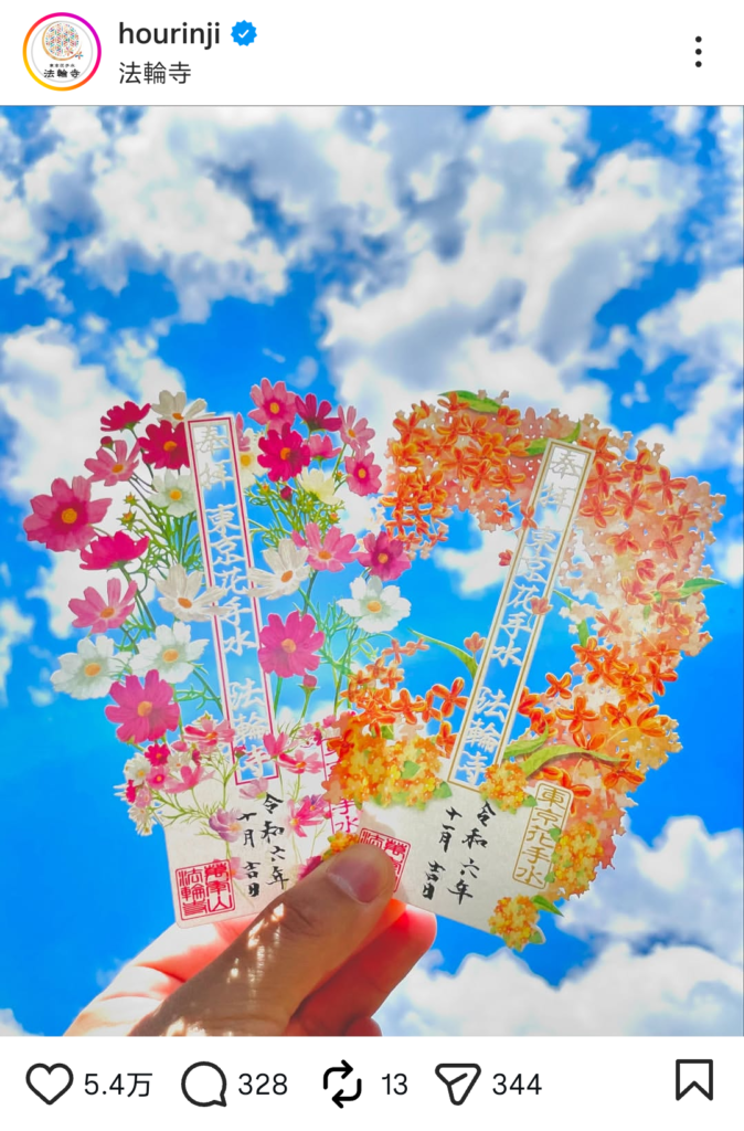 法輪寺位於東京早稻田,寺院每月都會推出花朵剪紙主題的限定御朱印。朱印設計根據當季花卉而變,如櫻花、紫陽花、非洲菊、金木犀等。