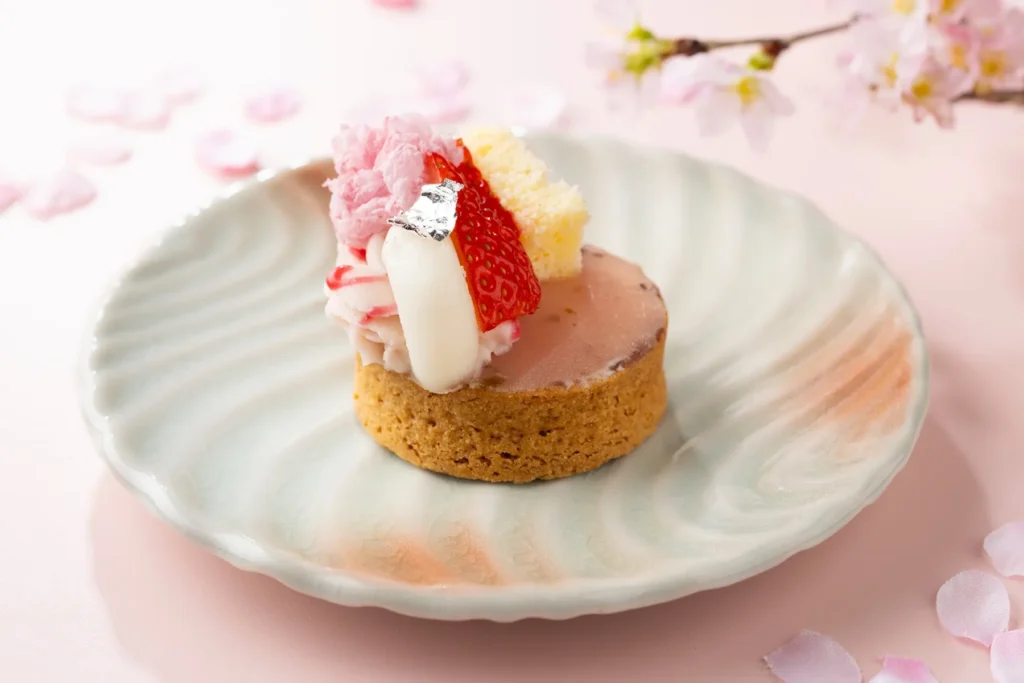 鹹點部分融入春日和風元素,例如帶有草莓香氣的雞肉舒普雷姆,以及結合櫻花與竹筍的梅里梅羅搭配螢烏賊等創意料理,為傳統下午茶增添一抹優雅的日式春季風情。