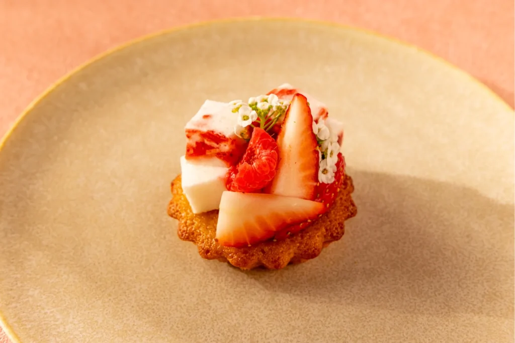 甜點部分結合櫻花與發酵元素的柔和甜味,包括夾入櫻花奶油與草莓的特羅佩茲麵包、融合法式與日式風味的酒粕奶油最中、茶香濃郁的伯爵茶棉花糖夾餅、抹茶巴斯克起司蛋糕,以及以甘酒與柑橘層疊而成的清爽玻璃甜點。鹹點則以鹽麴雞肉三明治、西京味噌豆腐布朗曼傑、煙燻干貝塔、黑米稻荷壽司等呈現春季食材的細膩旨味,並附上櫻花甘酒增添儀式感。