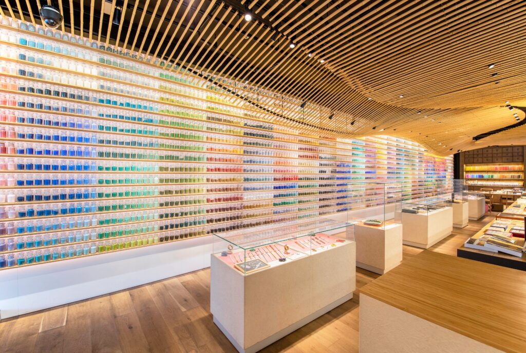 2, 文青必訪|PIGMENT TOKYO: 距離展覽步行 5 分鐘,這是一家美得像博物館的畫具店。整片牆陳列著 4,500 種色彩的顏料與稀有畫筆,非常符合妖怪展那種色彩繽紛的視覺感。