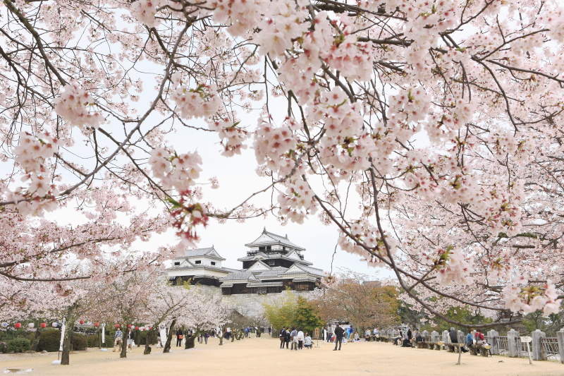 春季時,城內約有100株櫻花陸續綻放,包括染井吉野櫻、早開的椿寒櫻,以及晚開的大島櫻、鹽釜櫻、牡丹櫻等,花期銜接,賞櫻時間相對較長。雖會因氣候而略有差異,例年最佳觀賞期約在4月上旬。站在天守遠眺櫻花與松山市街景交織的春色,別有一番風情。