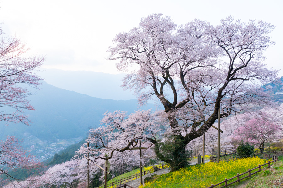 【山間的千年孤島】 這是一株樹齡約 500 年,樹高約 21 公尺、樹幹基部周長約 6 公尺的巨型櫻花樹,其學名為「江戶彼岸櫻」,但因花朵萼筒下部呈球狀膨起,側面看起來宛如葫蘆,因此被暱稱為「葫蘆櫻」(瓢簞),並被指定為縣級天然紀念物。