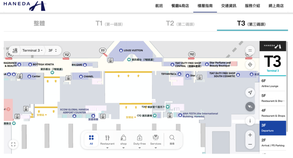 如果你第一次來羽田機場,一定會想知道機場裡面長什麼樣子、哪裡是登機口、哪裡有商店餐廳、怎麼從入境到入境大廳再到交通出口。羽田機場官方有提供 航廈樓層指南+地圖,可以讓你在出發前就先熟悉每一層樓的配置,對於進出境、轉機或是想安排餐廳/免稅店位置都很有幫助。這份地圖會依照航廈分成第1、第2以及第3航廈的各樓層,可以看到各樓層的服務、商店位置,以便你提前規劃動線。官方的地圖還會標示出電梯、手扶梯、登機口入口、入境大廳、巴士與計程車搭乘處等設施位置,都很實用。想直接看地圖的話,可以用這個官方連結→ [羽田機場樓層指南地圖](進去後可以選第1~第3航廈、各樓層來查看)。