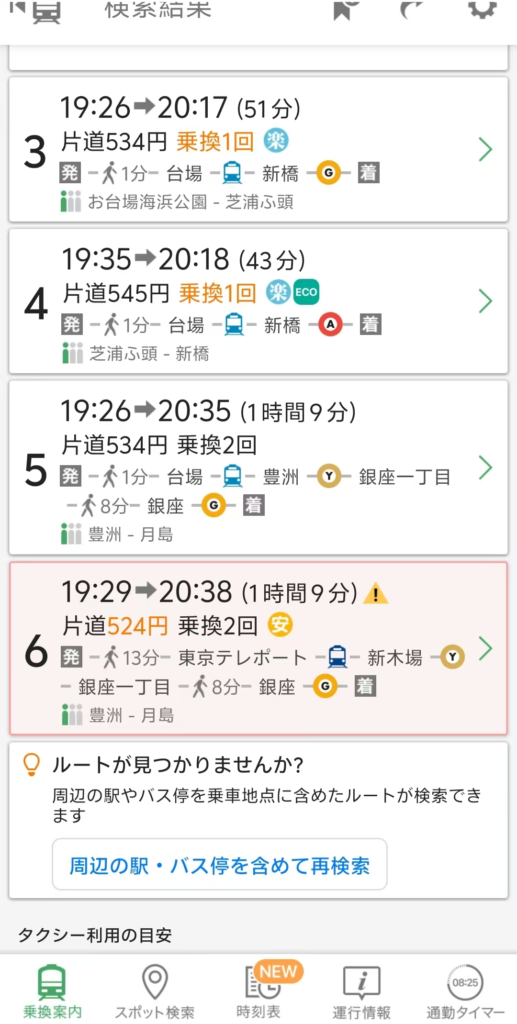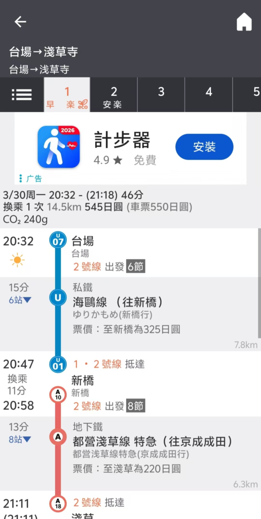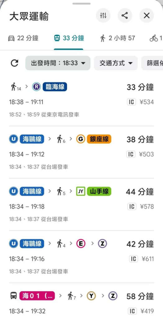 ※在 Japan Transit Planner 中,系統會提供多條路線,並以以下標示區分: