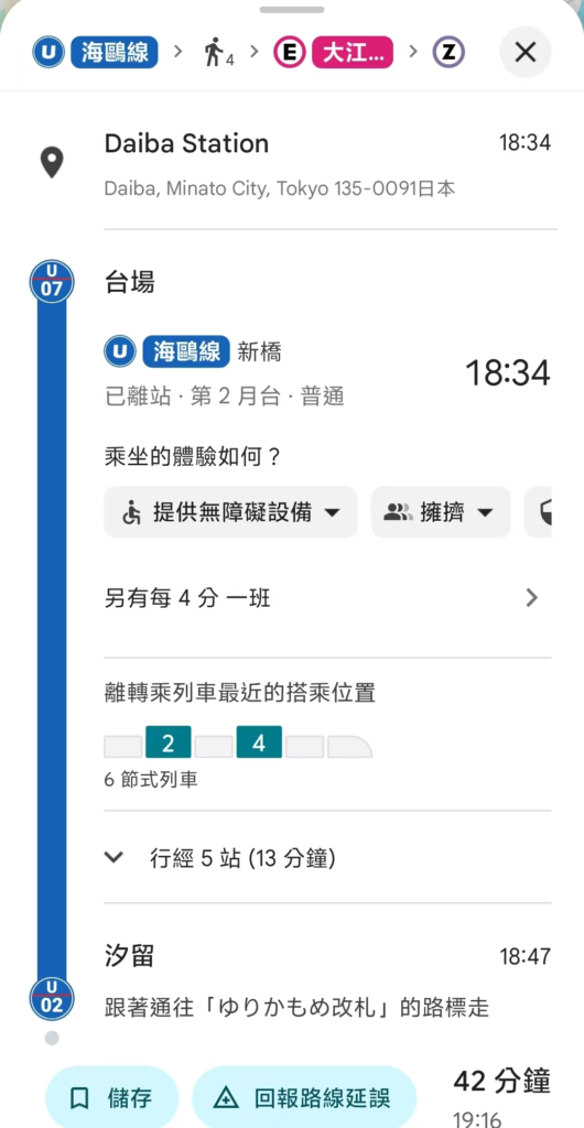 在日本使用時,Google Maps 已經可以顯示部分路線的「建議車廂位置」與轉乘方式,對多數旅人來說已相當夠用。不過在即時延誤資訊、列車細節(如精確月台資訊、細緻時刻表)等方面,日本本地 App 更為完整。