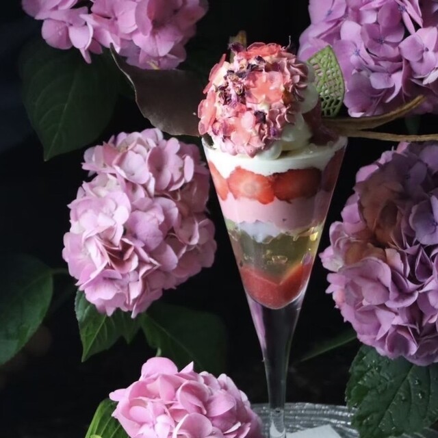 例如使用紫陽花、椿等意象,將水果、冰淇淋、果凍組合成一個完整的「故事結構」。