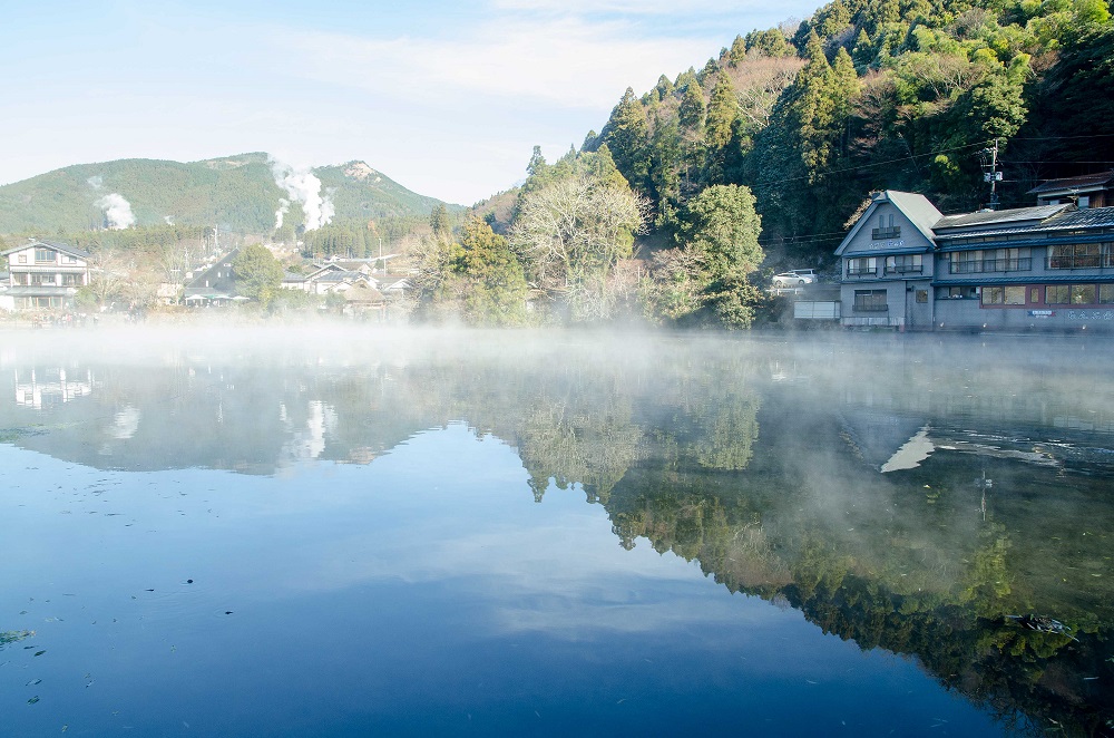 金鱗湖:金鱗湖靜靜地坐落在由布院小鎮的盡頭,被樹林與山影環抱。湖面不大,卻有一種格外溫柔的氣息。清晨時,湖水因溫泉與地下水的交會而升起淡淡霧氣,薄霧在水面緩緩流動,遠處的由布岳與岸邊的樹影倒映其中,使整片景色彷彿帶著一層柔和的光。