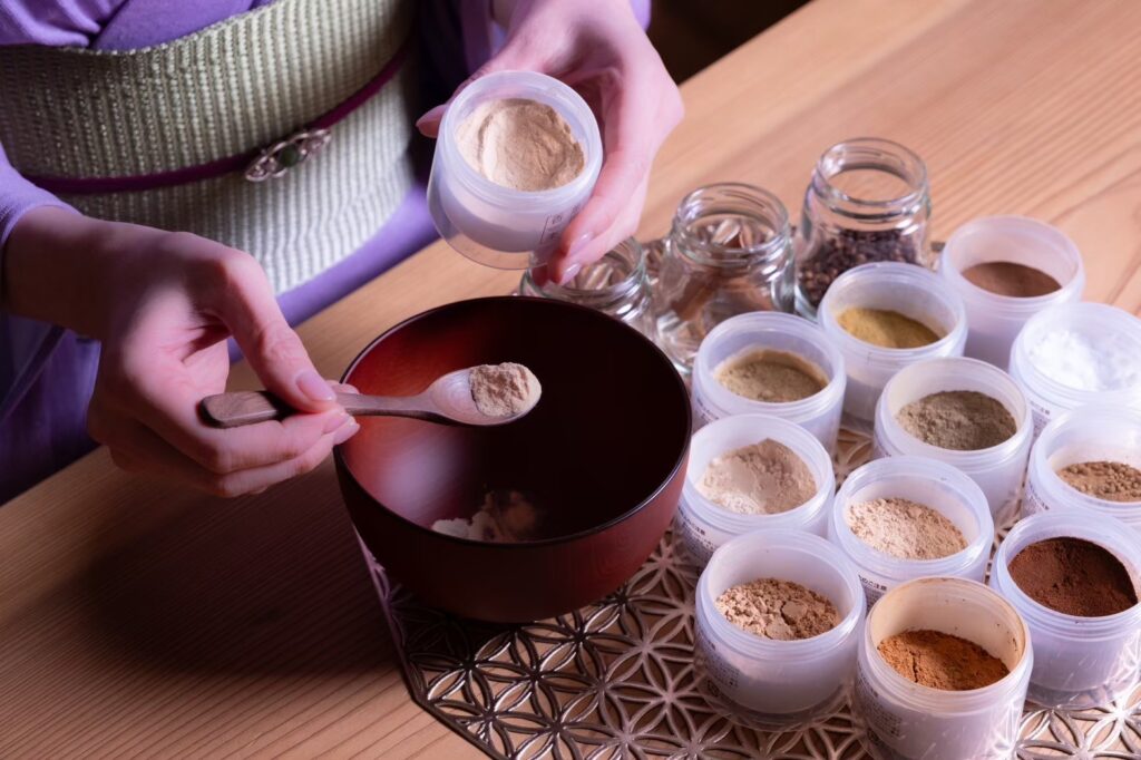 塗香製作:將檀香、丁香、肉桂等多種香木研磨調和,揉製成塗香。過程專注於香氣與手感的細微變化,是淨化身心的修行。完成的塗香可隨身攜帶,在參拜或冥想前使用。