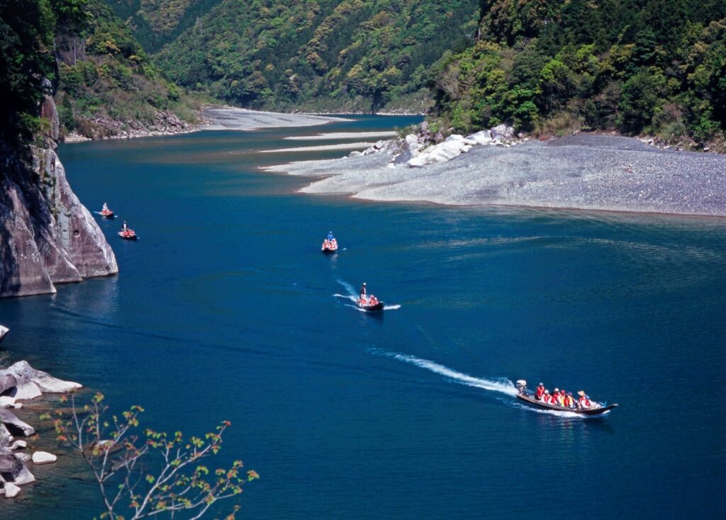 乘傳統木船,戴斗笠,順熊野川而下。這是全球唯一被登錄為世界遺產的「河流朝聖路線」,中世紀皇族與貴族從熊野本宮大社乘船前往熊野速玉大社即走此水路。沿途可欣賞「布引瀑布」、「靡石」、「釣鐘石」等自然奇景。春秋季節船夫偶爾吹奏篠笛,笛聲在山谷與水聲間迴盪。