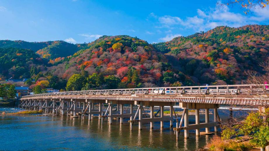 穿梭幽深竹林,陽光透葉灑落斑駁光影;緩步渡月橋,四季風景各擅其美——秋山斑斕如錦,冬景清瘦留白,盡顯京都獨有的侘寂之美。