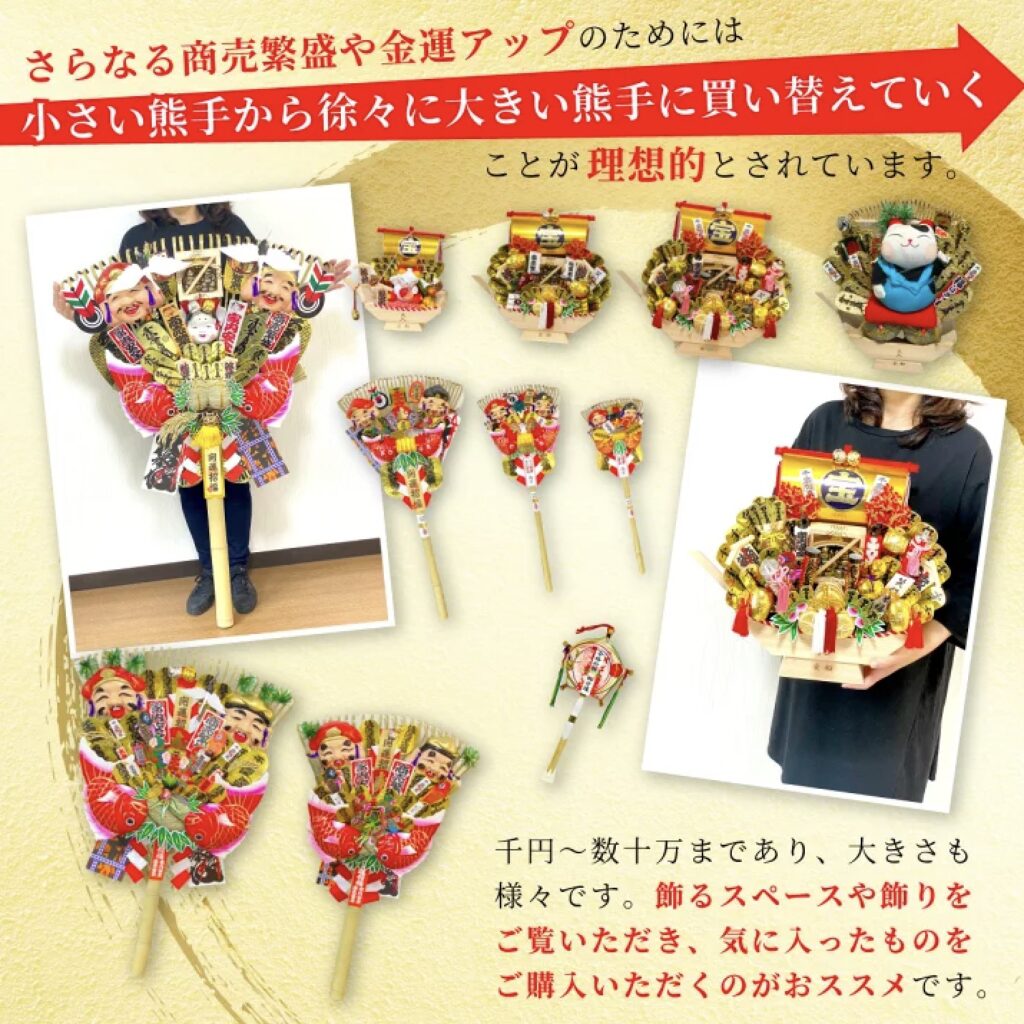 第一次購買熊手時,一定要先買小尺寸,之後每年購買一個比前一年大一號尺寸的,寓意生意越來越大。